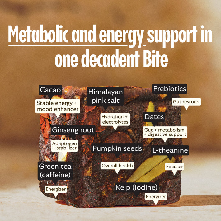 Crafted with green tea caffeine, L-theanine, ginseng root, and pumpkin seeds, this power-packed Bite fuels endurance, enhances focus, and supports muscle function without the jitters or crashes. Whether you're lifting, running, or staying active throughout the day, Energy Aid helps you power through with sustainable energy and balanced nutrition.