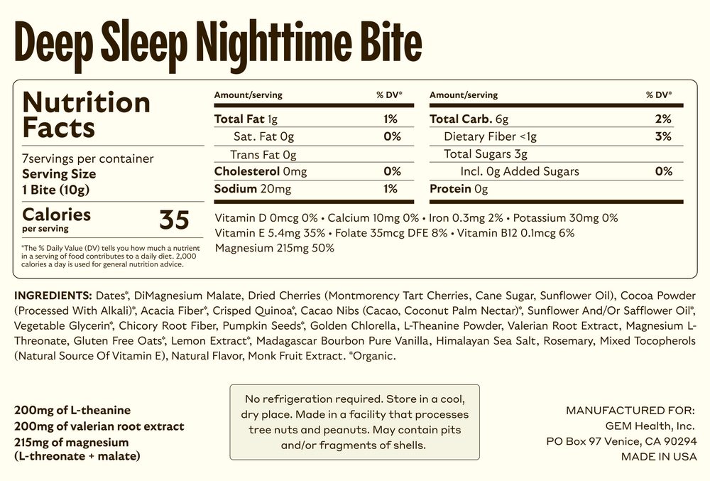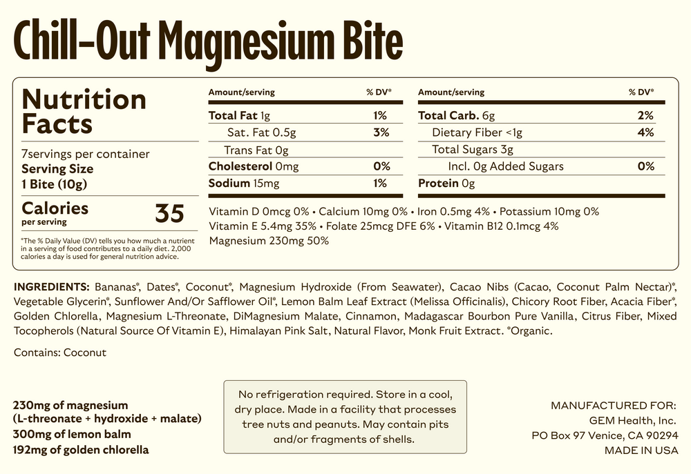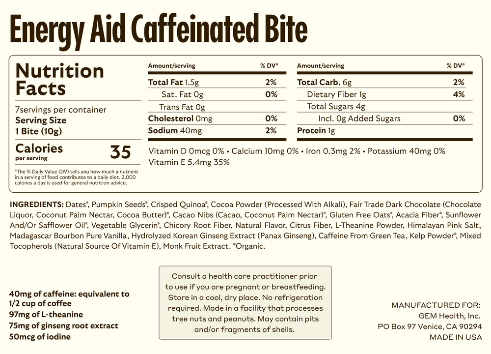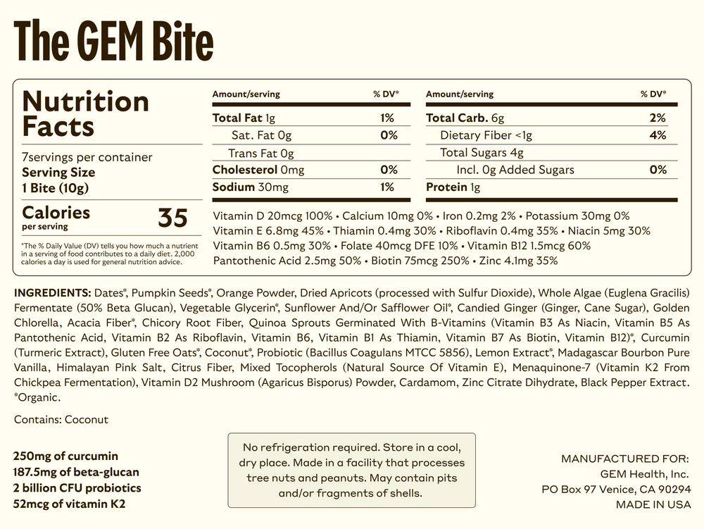 Dates*, Pumpkin Seeds*, Orange Powder, Dried Apricots (Processed With Sulfur Dioxide), Whole Algae (Euglena Gracilis) Fermentate (50% Beta Glucan), Vegetable Glycerin*, Sunflower And/Or Safflower Oil*, Candied Ginger (Ginger, Cane Sugar), Golden Chlorella, Acacia Fiber*, Chicory Root Fiber, Quinoa Sprouts Germinated With B-Vitamins (Vitamin B3 As Niacin, Vitamin B5 As Pantothenic Acid, Vitamin B2 As Riboflavin, Vitamin B6, Vitamin B1 As Thiamine, Vitamin B7 As Biotin, Vitamin B12)*, Curcumin (Turmeric Extract), Coconut*, Gluten Free Oats*, Probiotic (Bacillus Coagulans MTCC 5856), Lemon Extract*, Madagascar Bourbon Pure Vanilla, Himalayan Pink Salt, Citrus Fiber, Mixed Tocopherols (Natural Source Of Vitamin E), Menaquinone-7 (Vitamin K2 From Chickpea Fermentation), Vitamin D2 Mushroom (Agaricus Bisporus) Powder, Cardamom, Zinc Citrate Dihydrate, Black Pepper Extract. *Organic.
