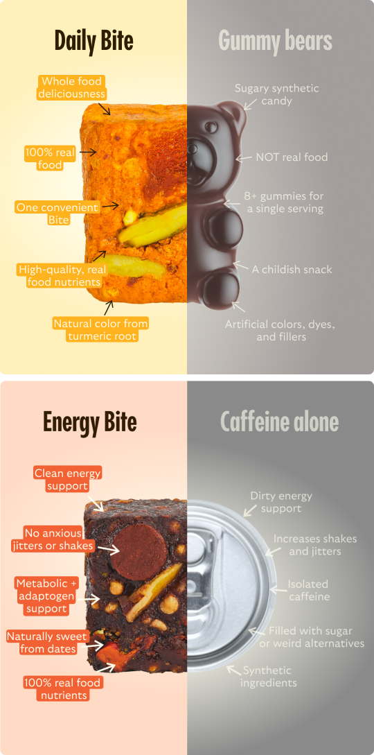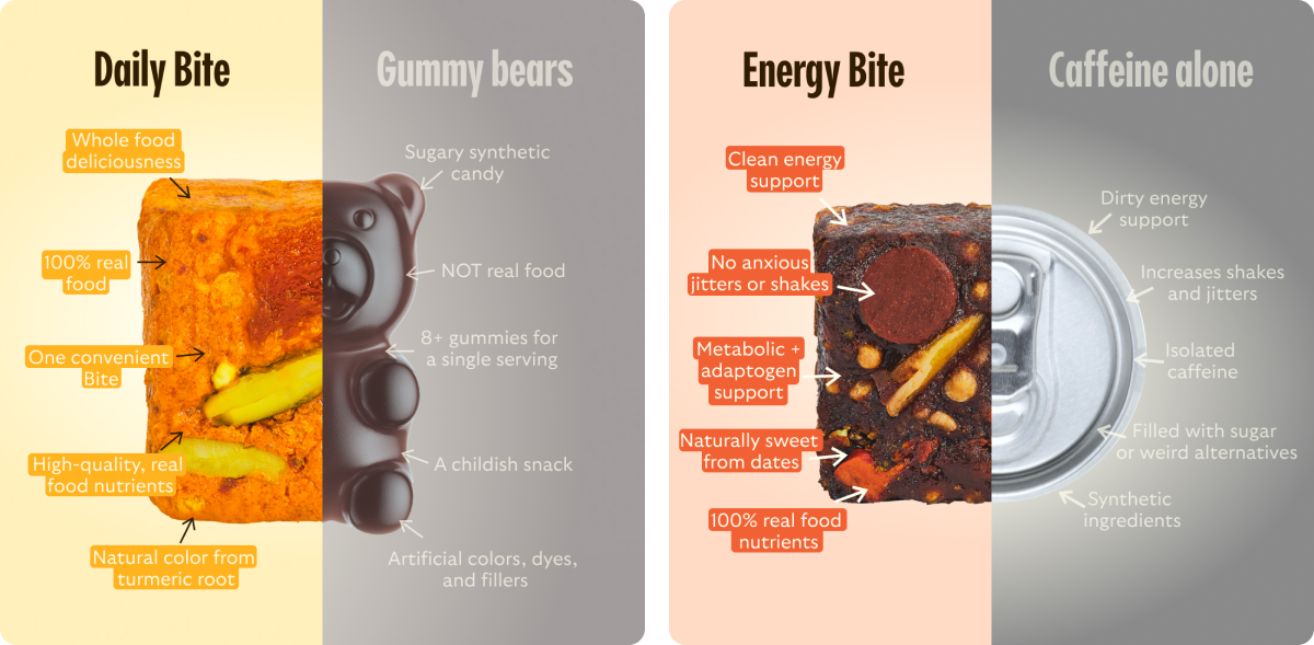 Delicious, real-food Bites packed with essential nutrients to help fill daily gaps and bolster energy levels — no pills, capsules, or synthetic nutrients. Made with clean, functional ingredients from whole foods for proper absorption and real results.