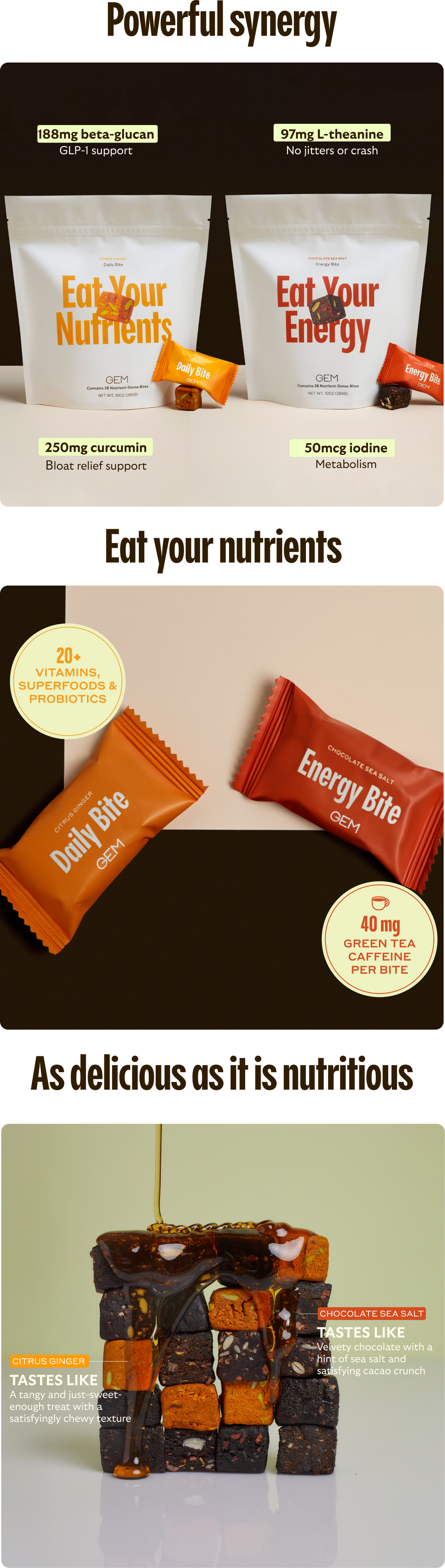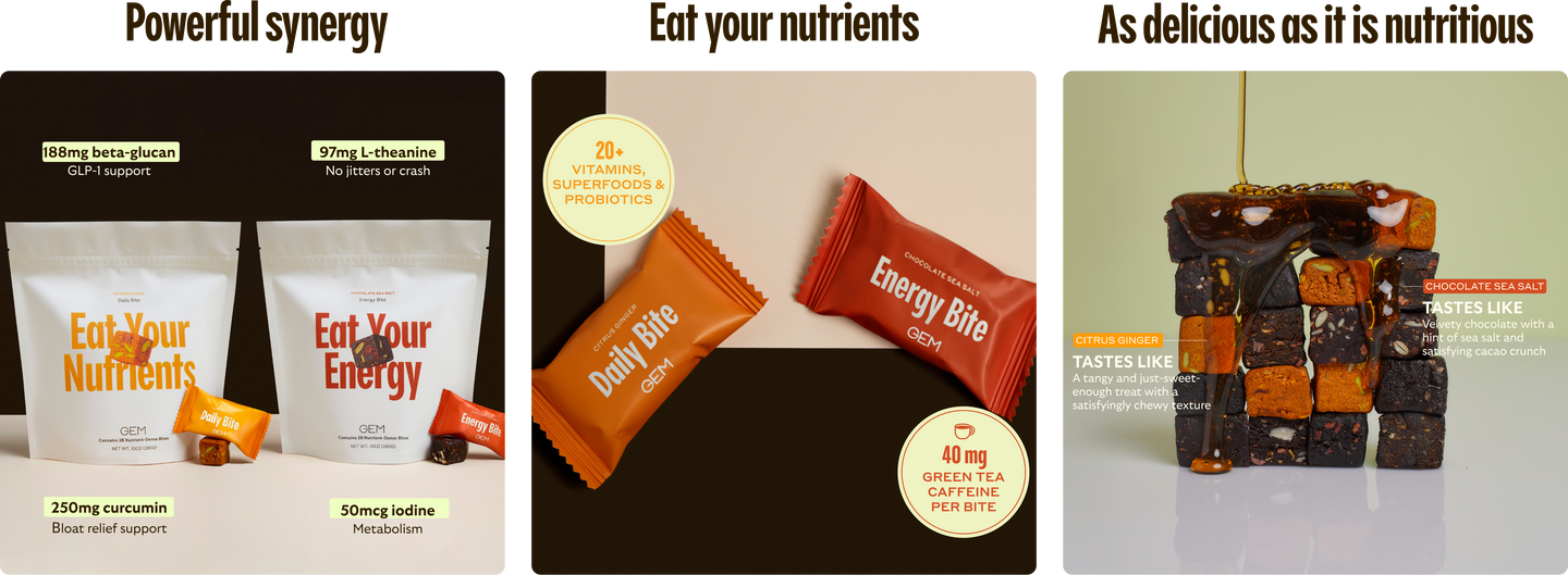 - Energy Bite: your afternoon pick-me-up for metabolism and holistic energy support. Formulated with iodine from kelp, caffeine from green tea, l-theanine, and ginseng