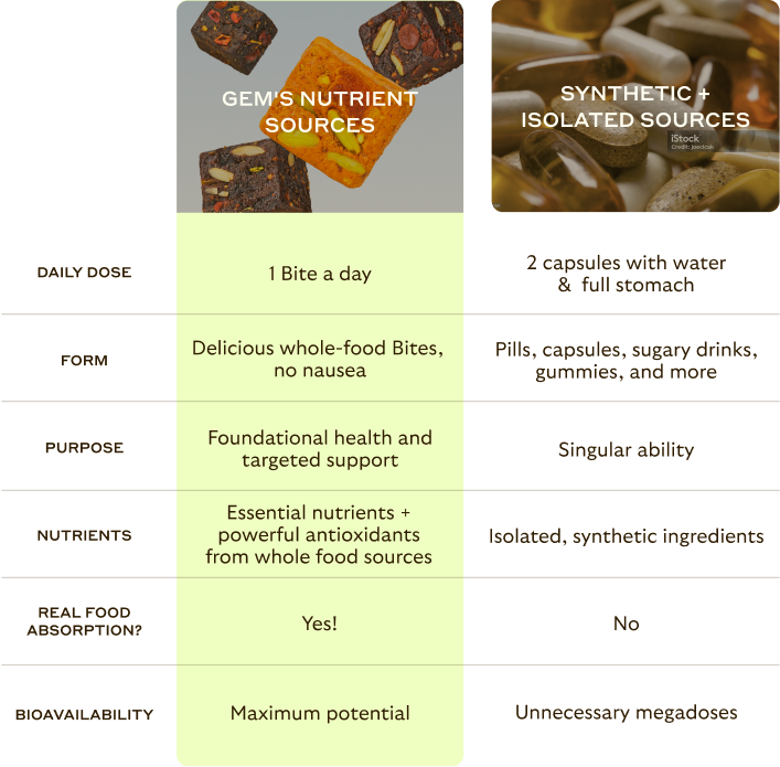 Instead of creating another synthetic supplement formulated with ingredients our bodies aren't able to optimally absorb, Sara created GEM.