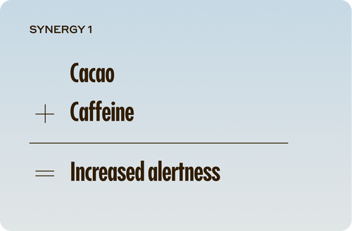 Cacao is rich in magnesium and contains theobromine. Theobromine is one of the elements that your body turns caffeine into. It's a vasodilator, meaning it gets the blood to pump. Unlike caffeine, theobromine is mainly fat soluble so it peaks more slowly than caffeine in the blood.