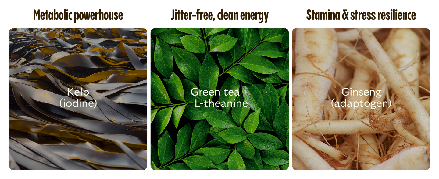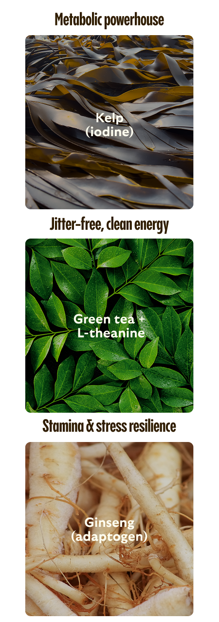 Instant food-fueled energy without the jitters or the crash. Each Energy Aid Bite is packed with science-backed, whole-food nutrients — caffeine from green tea, antioxidant-rich ginseng, and thyroid-supporting kelp — to help you get going while also providing long-term metabolic support.